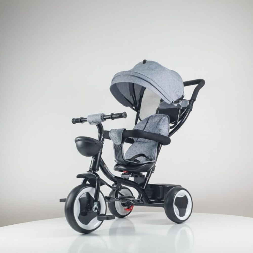 Tricikl Aristom 431 predstavlja multifunkcionalni tricikl koji raste zajedno sa detetom. Rotirajuće sedište od 360° omogućava vožnju licem ka roditelju ili unapred, što daje dodatnu sigurnost u najmlađem uzrastu. Podesiva tenda štiti od sunca, dok sigurnosni pojas i prečka obezbeđuju stabilnost tokom vožnje.