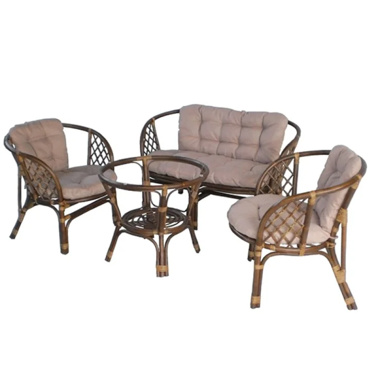 Set se sastoji od dve prostrane stolice, komfornog dvoseda i okruglog stola sa kaljenim staklom, savršenog za popodnevnu kafu ili večernje druženje.