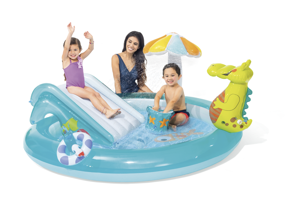 Bazen na naduvavanje sa toboganom koji sadrži dodatni zaštitni jastuk na kraju tobogana, suncobran u obliku pečurke, mali prsten u obliku patkice i kanticu na naduvavanje. Krokodil se može pretvoriti u prskalicu ukoliko se poveže sa baštenskim crevom. Namenjen za decu uzrasta od 2 godine i više.