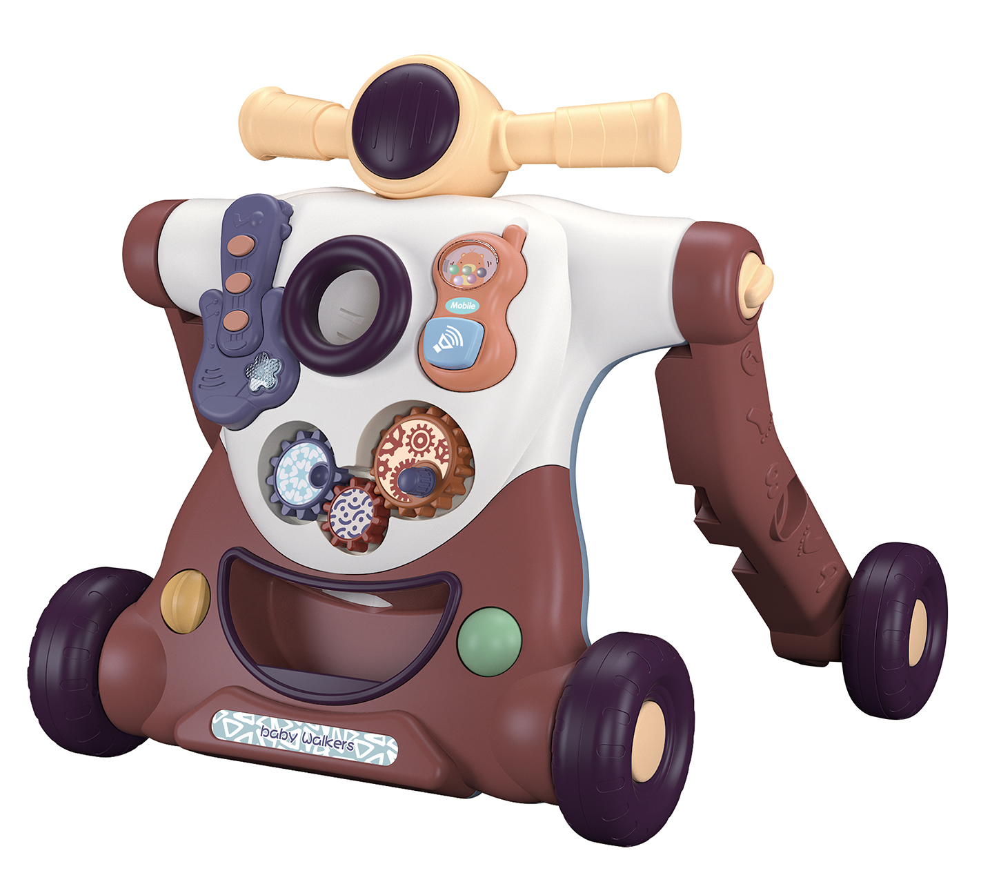 Prednja strana guralice je prava mala učionica! Sadrži zanimljive dugmiće, zupčanike i oblike koji razvijaju finu motoriku i koordinaciju ruku i očiju.