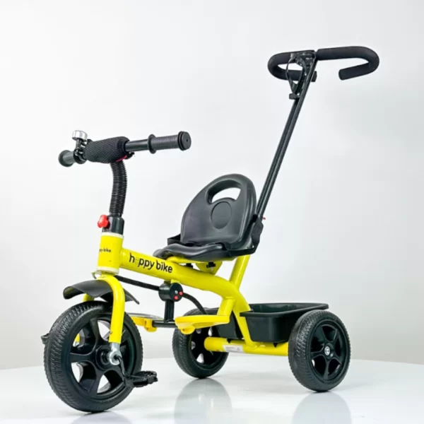 Dečiji tricikl Happybike 448 žuti sa ručkom za guranje je savršen izbor za prve avanture vašeg deteta na točkovima. Dizajniran za bezbednu i udobnu vožnju, ovaj tricikl kombinuje funkcionalnost, stabilnost i zabavu. Napravljen od čvrstog metala i opremljen EVA točkovima, pruža sigurnu vožnju i odličnu kontrolu kretanja. Upravljačka ručka omogućava roditeljima potpunu kontrolu u ranim fazama, dok dete ne stekne sigurnost da samostalno upravlja. Kada dete poraste, ručka se jednostavno uklanja i tricikl postaje igračka za samostalnu vožnju.