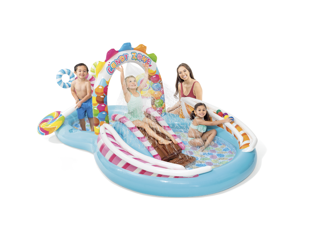 Igraonica na naduvavanje Candy Zone iz sveta slatkiša. Sastoji se od dva bazenčića i tobogana u obliku čokolade, sa dodatnim obloženim delom za spuštanje i šarenim lukom sa prskalicom koji se može priključiti na baštensko crevo. Uz šest loptica Fun Ballz™, deca se mogu igrati ubacivanjem kroz tri prstena ili spuštanjem loptica niz dve staze. U kompletu su i dve velike lizalice na naduvavanje. Opremljena je ispusnim ventilom. Pogodno za decu od 2. godine.
