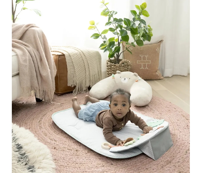Medved Nate čini najslađeg i najugodnijeg drugara u igri sa Ingenuiti™ Cozi Prop™ 4-u-1 prostirkom za sedenje i podupiranje. Nateove plišane ruke pružaju podršku bebi za isprobavanje sedeće igre u bezbednom prostoru dok gradi te mišiće. 4 režima omogućavaju bebi da otkrije izležavanje, vreme za stomak, sedenje i igranje kod kuće ili u pokretu sa prenosivim poslužavnikom za igru. Na poslužavniku se nalazi 5 senzornih igračaka inspirisanih prirodom, uključujući list peekabooa, odvojivo ogledalo medveda, oblak sa etiketama, biljku u saksiji od naborane tkanine i prsten od prirodnog drveta. Posuda i podmetač za igru na sklapanje su napravljeni od meke, udobne tkanine, a prostirka se lako stavlja u torbu za pelene i nosi u pokretu. Otirač se može prati u mašini, a jastuk, poslužavnik i igračke se mogu brisati radi lakšeg čišćenja. Kako vaše dete raste, jastuk za medveda pomaže bebi da podrži bebu tokom svake faze kako bi bio udoban pratilac tokom godina male dece.