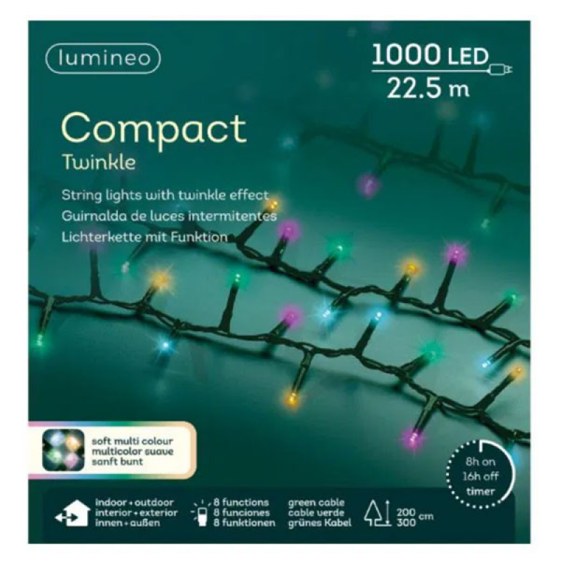 Novogodišnja LED rasveta za jelku 2250cm 8 funkcija Multi Lumineo 495472 savršena je za jelke visine od 200 do 300 cm. Opremljena sa 1000 multikolor LED sijalica sa efektom svetlucanja, ova rasveta stvara praznični ugođaj. Sa 8 različitih funkcija osvetljenja, omogućava fleksibilnost u odabiru željene atmosfere. Razmak između lampica je 2,2 cm, što stvara gusto i efektno osvetljenje. Ova rasveta je namenjena za unutrašnju i spoljašnju upotrebu, sa zaštitom IP44. Zelena boja kabla dobro se uklapa uz boju jelke, dok ukupna dužina sistema, uključujući napojni kabl od 5 m, iznosi 27,5 m. Ima funkciju tajmera (8h uključena/16h isključena) i radi na mrežno napajanje, bez zvučnih efekata i muzike.