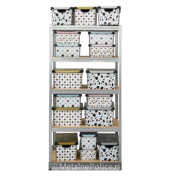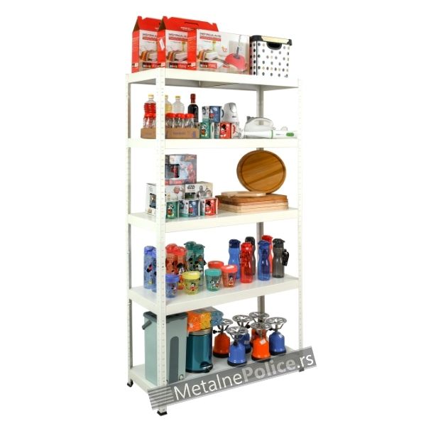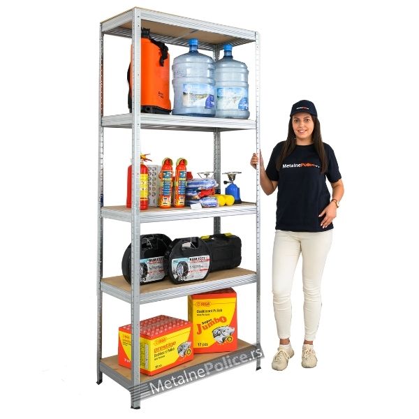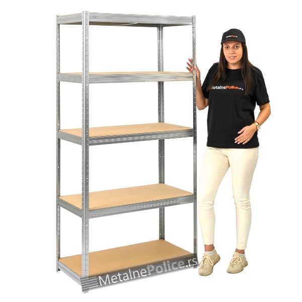 Polica metal-medijapan. Visina 180cm, širina 90cm i dubina 40cm. 5 nivoa, svaki nosi 300kg, ukupna nosivost 1500kg. Boja – siva, galvanizovani metal. Konstrukcija metalna L profil 30×30. Montaža na žlebove. Nivoi MDF ploče