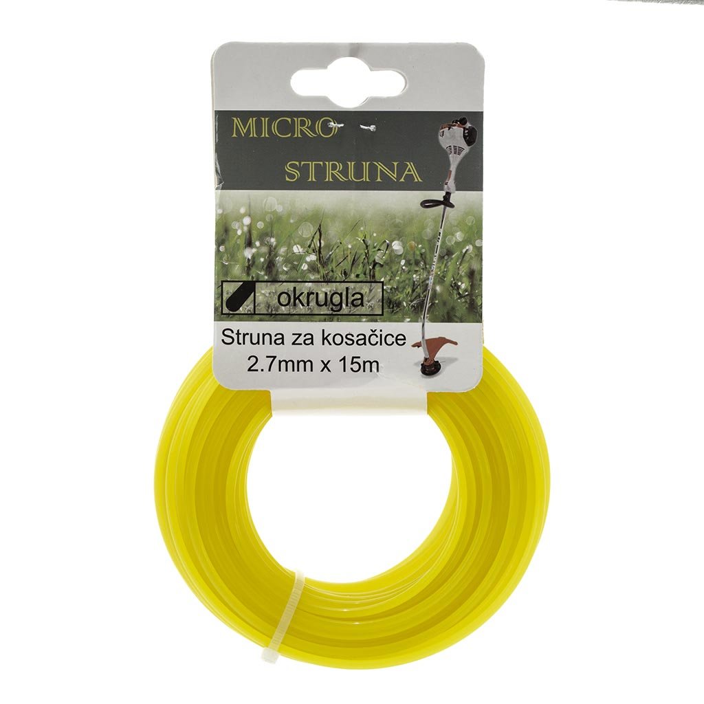 Plastificirane strune raznih boja i dimenzija koriste se kao dodatak za električne i benzinske trimere zarad košenja i uređivanja bašta, vrtova i dvorišta. Na koturu se nalazi 15 dužnih metara.Deklaracija: Šifra i naziv proizvoda: 5732 Struna za kosačice 2,7mmx15m okrugli Uvoznik: Microcer d.o.o. Poreklo: Kina Jedinica mere: kom